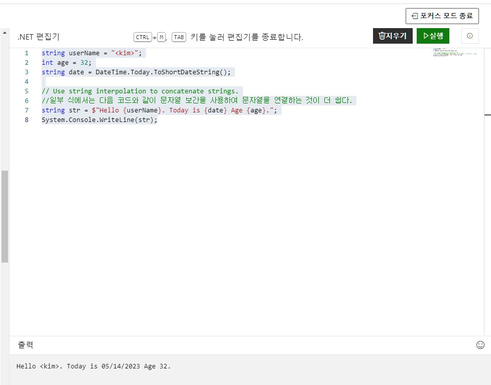 //일부 식에서는 다음 코드와 같이 문자열 보간을 사용하여 문자열을 연결하는 것이 더 쉽다.